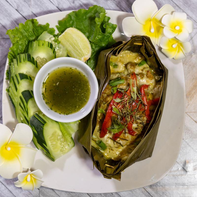 Discovered during the Angkorian Age. This is an amazing, authentic Cambodian favorite! Fish fillet marinated in blended herbs and spices, covered with coconut cream, wrapped and steamed in banana leaves