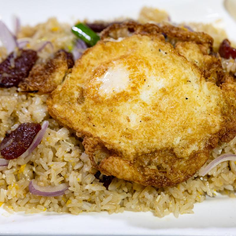 Jasmine fried rice stir fry with Chinese sausage and chicken, topped with over-medium fried egg