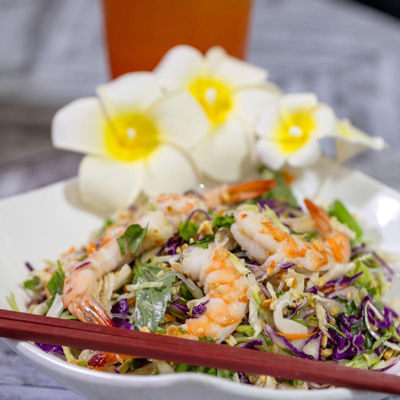 Vermicelli noodles and hyour choice of tofu, chicken, pork, or beef over bedded seasonal herbs and vegetables served with house sweet fish sauce