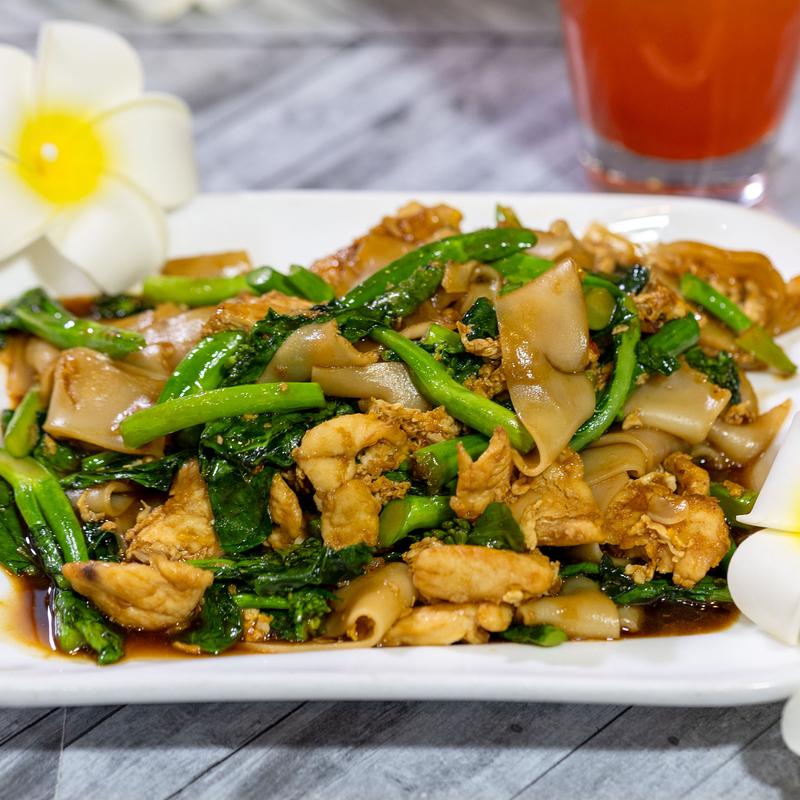 Large, wide noodles, egg, and Chinese broccoli stir-fried in sweet soy sauce
