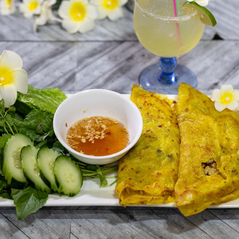 Pan Fried Asian Crepes with sauteed diced chicken, onions, and bean sprouts. Served with crushed peanuts and sweet fish sauce